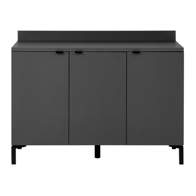 Armário inferior em MDP de 15 mm revestido com laminado melamínico de baixa pressão e bordas em PVC. Possui 3 portas com dobradiças com amortecedores e puxadores em chapa de aço pintada, 5 nichos e pés em polipropileno.Tampo em MDP de 25 mm, com frontão de 15 mm, revestido com laminado melamínico de baixa pressão e bordas em PVC. Para o uso com módulos inferiores de 1,20 m da mesma linha (vendidos separadamente).