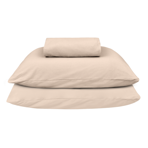 Jogo para cama de casal em malha 100% algodão. Composto por: 1 lençol com elástico (1,38 cm x 1,88 m x 30 cm) e 2 fronhas (50 cm x 70 cm).