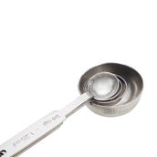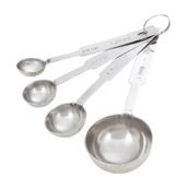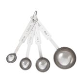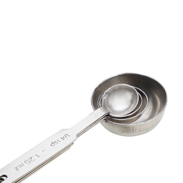 Kit com 4 colheres medidoras, em aço inoxidável. Capacidade em colheres: 1/4 colher de chá (1,25 ml), 1/2 colher de chá (2,5 ml), 1 colher de chá - (5 ml) e 1 colher de sopa (15 ml).