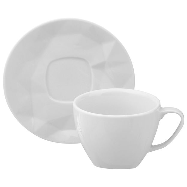 Jogo de louças em porcelana com detalhes em alto-relevo. Composto por 16 pratos, sendo 4 rasos, 4 fundos, 4 para sobremesa e 4 xícaras para chá com pires.