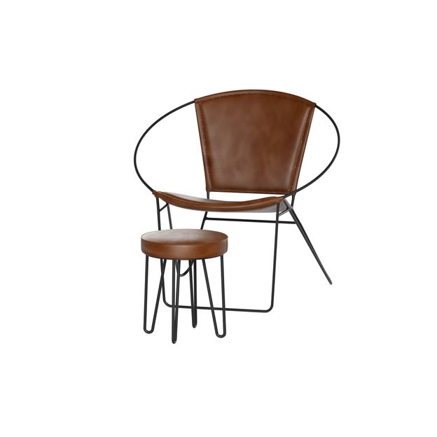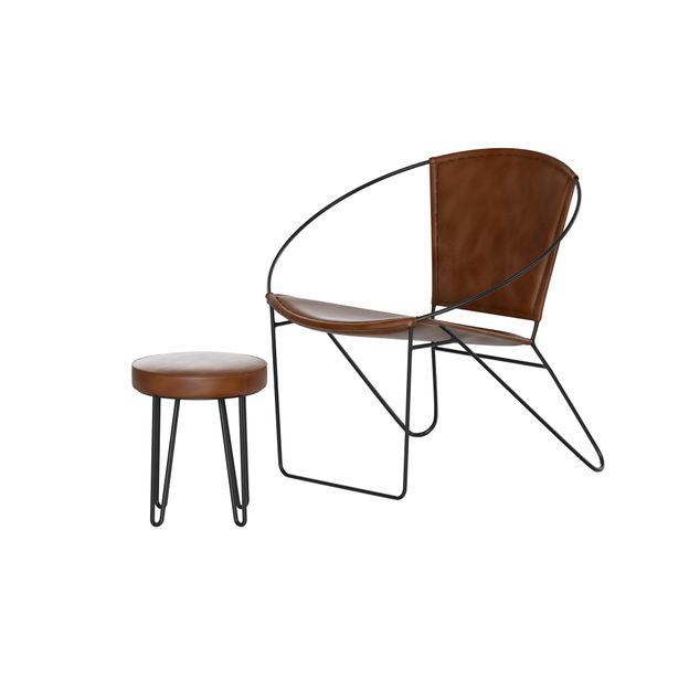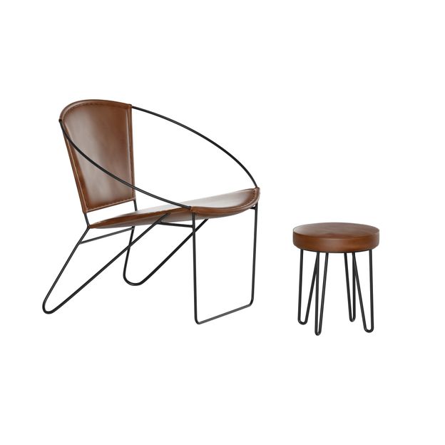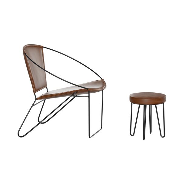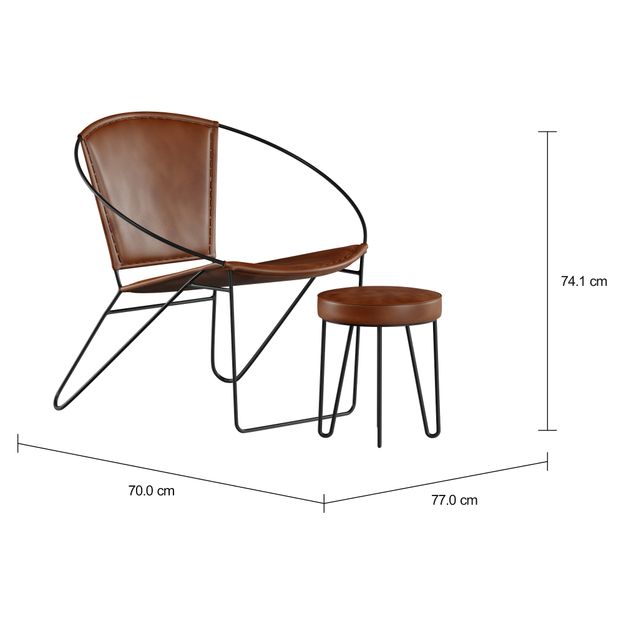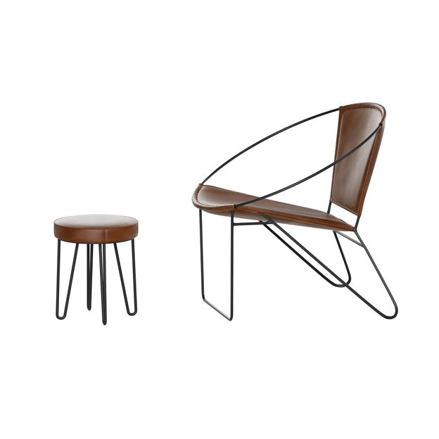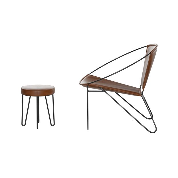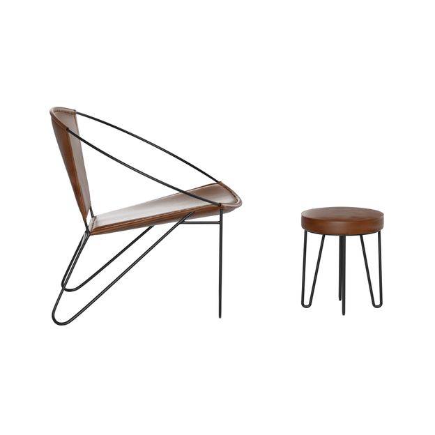 Poltrona com assento/encosto em couro e estrutura em perfil de aço com acabamento em pintura epóxi-pó. Possui detalhes em pesponto.Puff em couro com estrutura em perfil de aço com acabamento em pintura epóxi-pó e assento em compensado multilaminado revestido com espuma (D32). Possui bordas em debrum.