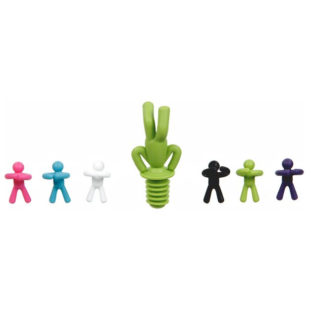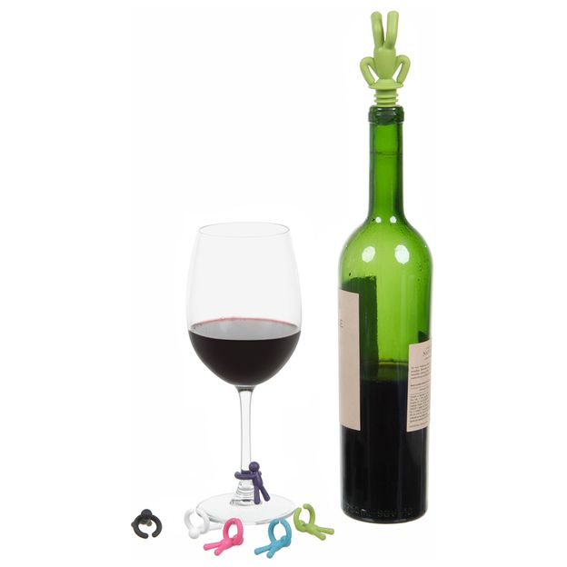 Kit para vinho com 6 marcadores para taça e uma tampa para garrafa em silicone.