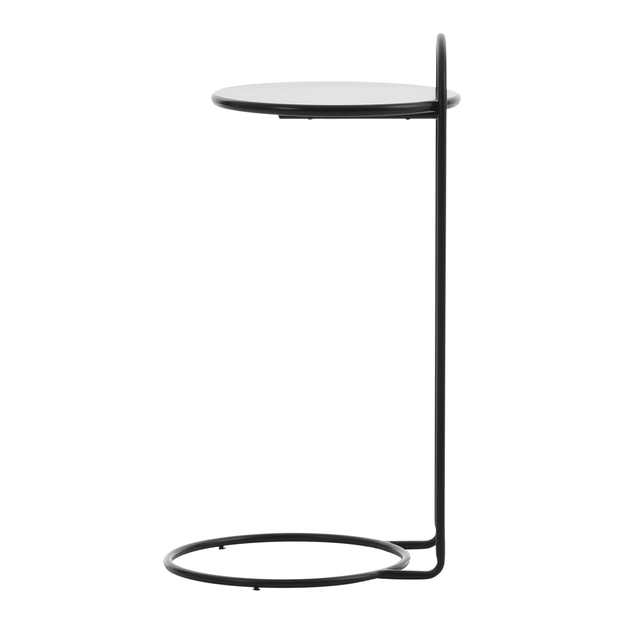 Mesa lateral, com estrutura em tubo de aço carbono com acabamento em pintura epóxi-pó e tampo em MDF de 15 mm com acabamento em pintura poliuretânica. Possui sapatas plásticas e alça para manuseio.