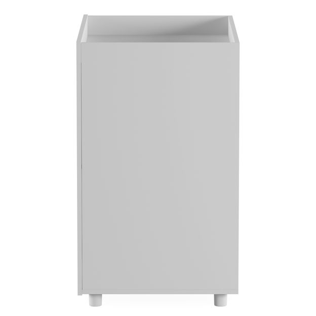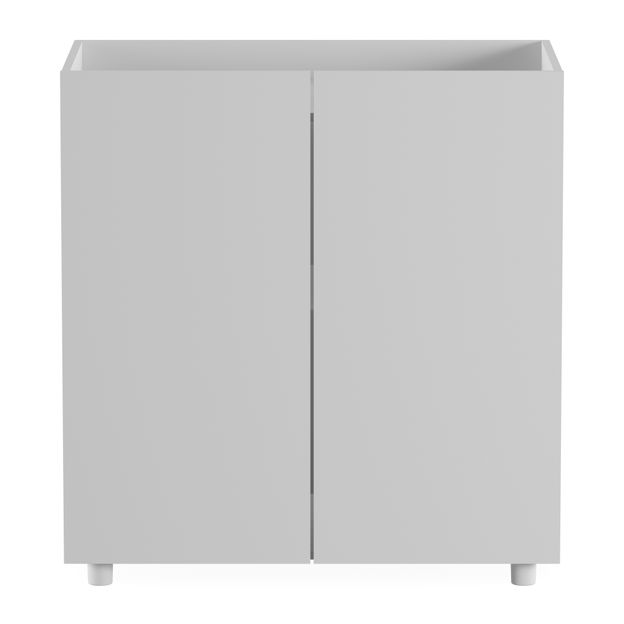 Armário para lavanderia, em MDP (Medium Density Particleboard) com acabamento em pintura. Possui 2 portas, 2 nichos e pés plásticos.