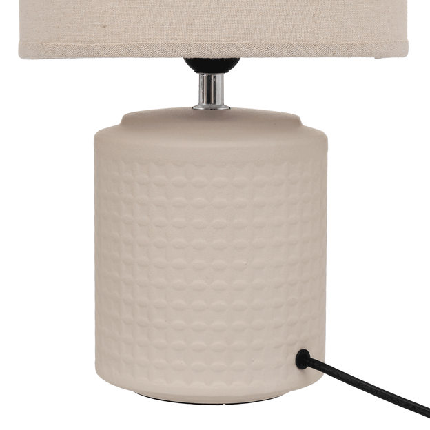 Luminária de mesa, em cerâmica com acabamento em pintura. Possui cúpula com estrutura em aramado de aço revestida com tecido 100% algodão.