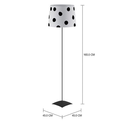 Base de luminária de piso, 127/220V, em chapa e tubo de aço com acabamento em pintura epóxi-pó e aplicação de verniz poliuretano. Possui soquete rosca E27.Cúpula com estrutura em aramado de aço com acabamento em pintura epóxi-pó revestida com acetato e tecido 100% poliéster com aplicação de estampa.