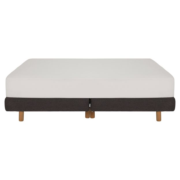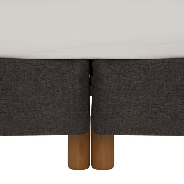 Base para cama box queen, em madeira maciça de reflorestamento (Eucalipto) revestida com espuma de poliuretano (D18) e tecido 53% algodão/47% poliéster. Possui pés em madeira maciça (Eucalipto) tingida com aplicação de verniz.