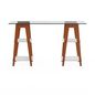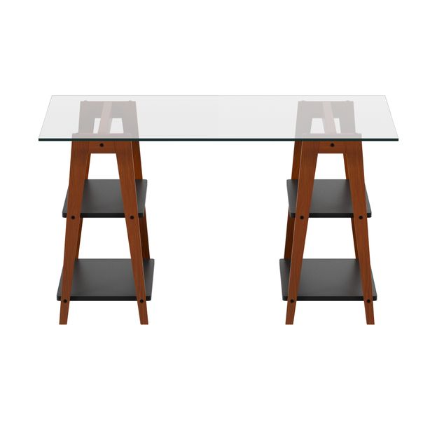 Cavalete com estrutura em madeira maciça de reflorestamento (Pinus Elliottii) tingida. Possui 2 prateleiras em MDF (Medium Density Fiberboard) de 18 mm com acabamento em pintura poliuretânica.Tampo em vidro cristal incolor 10 mm temperado, com bordas lapidadas.
