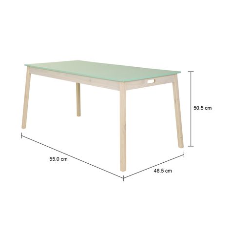 Mesa com estrutura em madeira maciça de reflorestamento (Pinus Elliottii) tingida com aplicação de verniz e tampo em MDF (Medium Density Fiberboard) de 18 mm com acabamento em pintura laqueada. Possui recorte usinado para manuseio.