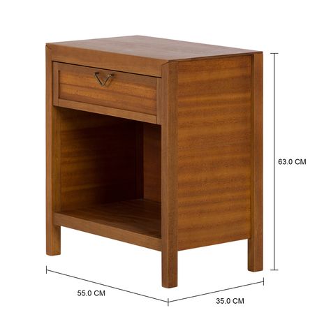Mesa de cabeceira em madeira maciça (Tauari e Pinus Elliottii) laminadas (Angelim) e tingidas, com acabamento encerado. Possui 1 gaveta com corrediças telescópicas, puxador em metal com tratamento em zinco marítimo e 1 nicho.