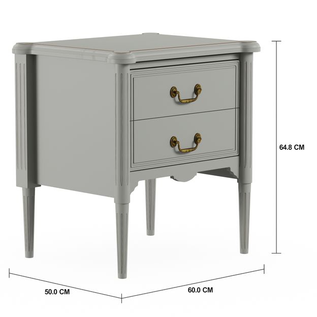 Mesa de cabeceira em MDF (Medium Density Fiberboard) e madeira maciça de reflorestamento (Pinus Elliottii) pintados com acabamento desgastado. Possui 2 gavetas com corrediças metálicas e puxadores em zamac com acabamento envelhecido.