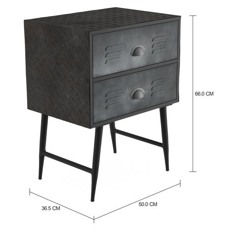 Mesa de cabeceira em chapa e tubo de aço com acabamento em pintura desgastada, aplicação de verniz e detalhes em alto-relevo. Possui 2 gavetas com puxadores inclusos e sapatas plásticas reguláveis.