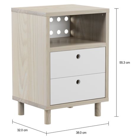 Mesa de cabeceira em madeira maciça (Pinus Elliottii) tingida com aplicação de verniz. Possui 2 gavetas em MDF (Medium Density Fiberboard) com acabamento em pintura e corrediças metálicas, 1 nicho com recortes usinados e pés maciços tingidos.