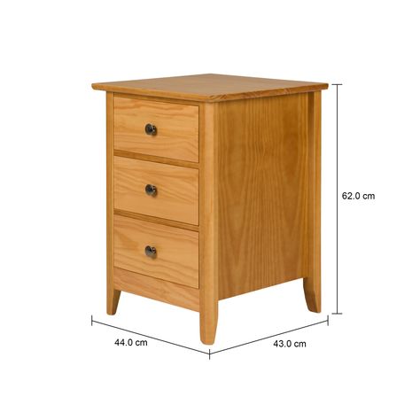 Mesa de cabeceira com estrutura em madeira maciça de reflorestamento (Pinus Elliottii) e MDF (Medium Density Fiberboard), tingidos com acabamento em verniz. Possui 3 gavetas com corrediças metálicas e puxadores em zamac.