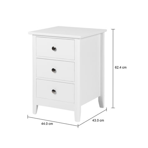 Mesa de cabeceira com estrutura em madeira maciça de reflorestamento (Pinus Elliottii) e MDF (Medium Density Fiberboard) com acabamento em pintura. Possui 3 gavetas com corrediças metálicas e puxadores em zamac.
