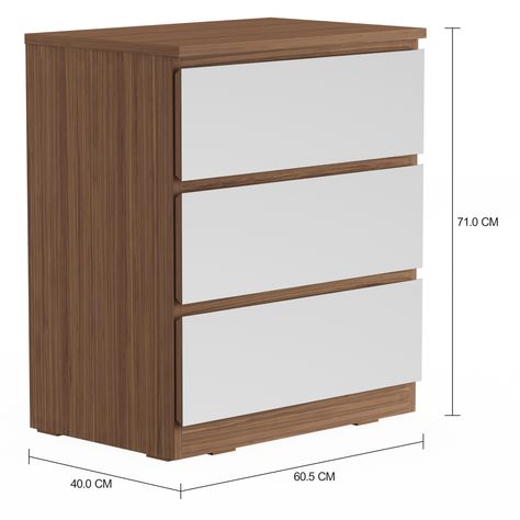 Mesa de cabeceira em MDF (Medium Density Fiberboard) com acabamento em pintura. Possui 3 gavetas espelhadas com corrediças telescópicas e sapatas plásticas.