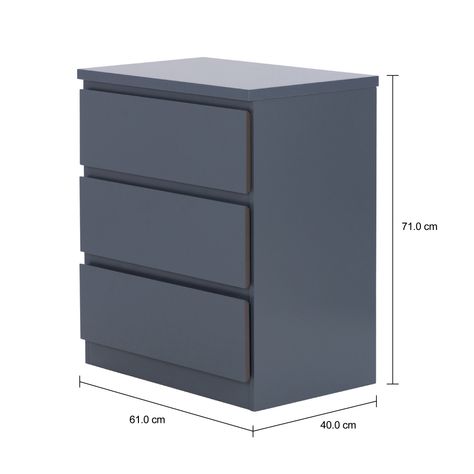 Mesa de cabeceira em MDP (Medium Density Particleboard) com acabamento em pintura. Possui 3 gavetas com corrediças telescópicas e sapatas plásticas.