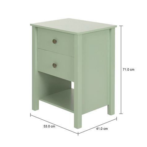 Mesa de cabeceira com estrutura em madeira maciça (Pinus Elliottii) com acabamento em pintura. Possui tampo em MDF de 15 mm, 2 gavetas com corrediças telescópicas e 1 prateleira