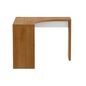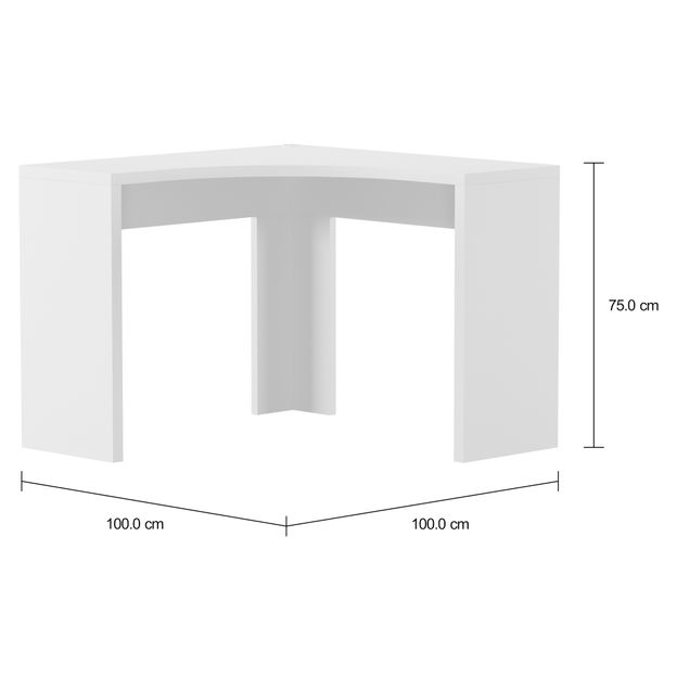 Mesa de canto em MDP (Medium Density Particleboard) e MDF (Medium Density Fiberboard) revestidos com laminado melamínico de baixa pressão e bordas em PVC. Possui passa-fios e sapatas plásticas.