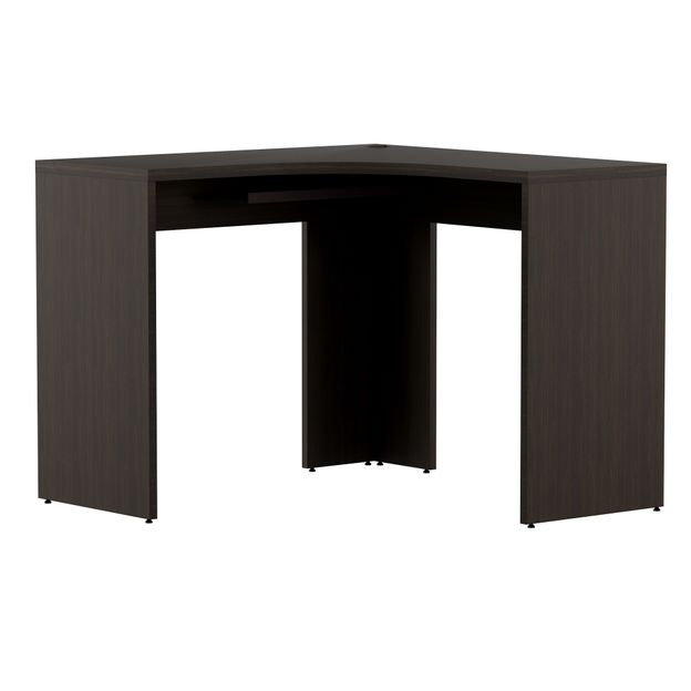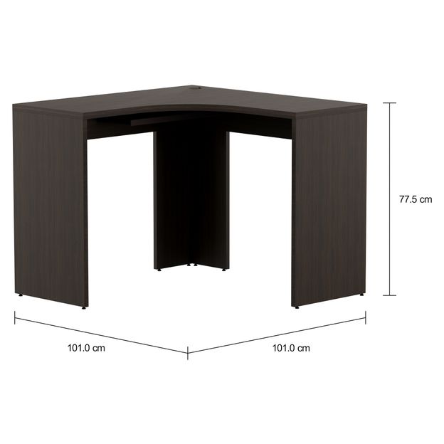 Mesa de canto com estrutura e tampo em painel de madeira aglomerada e MDF revestido com laminado melamínico de baixa pressão com acabamento de bordas em PVC. Possui passa-fio e sapatas plásticas ajustáveis.