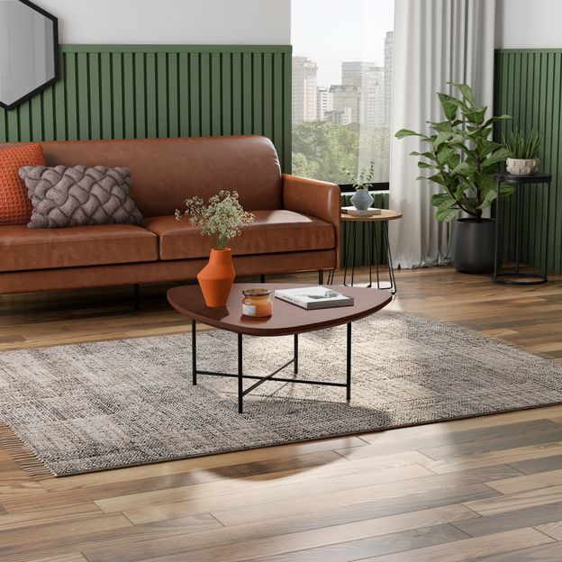 Mesa de centro com estrutura em tubo de aço com acabamento em pintura epóxi-pó e tampo em MDF (Medium Density Fiberboard) de 18 mm revestido com lâmina de madeira maciça (Pinus Elliottii) tingida. Possui sapatas plásticas.