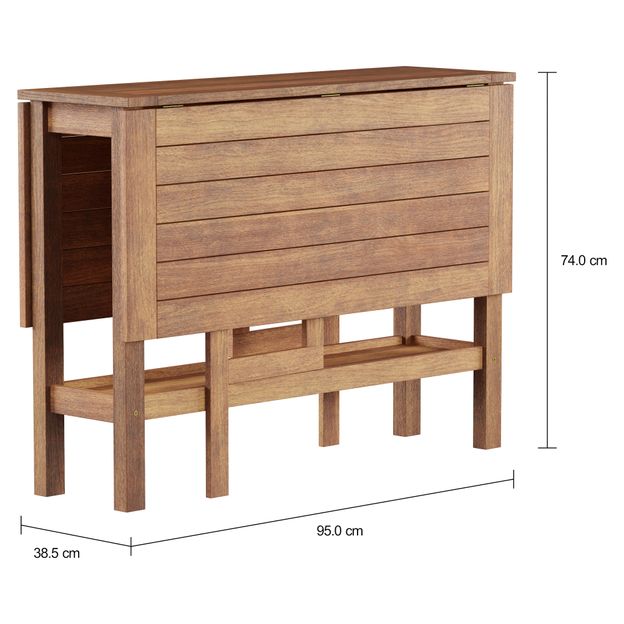 Mesa dobrável em madeira maciça de reflorestamento (Eucalipto) certificada 'FSC®', com acabamento tingidor impermeabilizante, tipo stain, com ação inseticida e fungicida. Possui vão que permite guardar 4 cadeiras da mesma linha (vendidas separadamente).