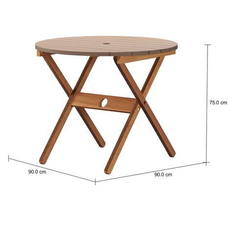 Mesa dobrável, em madeira maciça de reflorestamento (Eucalipto), com acabamento em tingidor impermeabilizante, tipo stain, com ação inseticida e fungicida. Possui furo central para guarda-sol com haste de até Ø5 cm e sapatas plásticas.