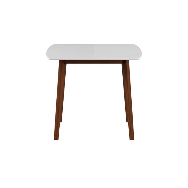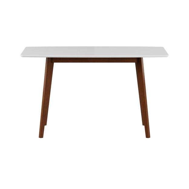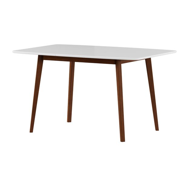 Mesa extensível, com estrutura em madeira maciça (Eucalipto) e tampo em MDF (Medium Density Fiberboard) com acabamento em pintura.