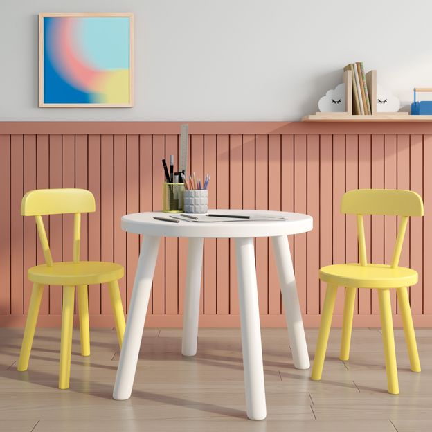 Mesa infantil, com estrutura em madeira maciça de reflorestamento (Pinus Elliottii e Eucalipto) e tampo em MDF (Medium Density Fiberboard) de 35 mm com acabamento em pintura poliuretânica.