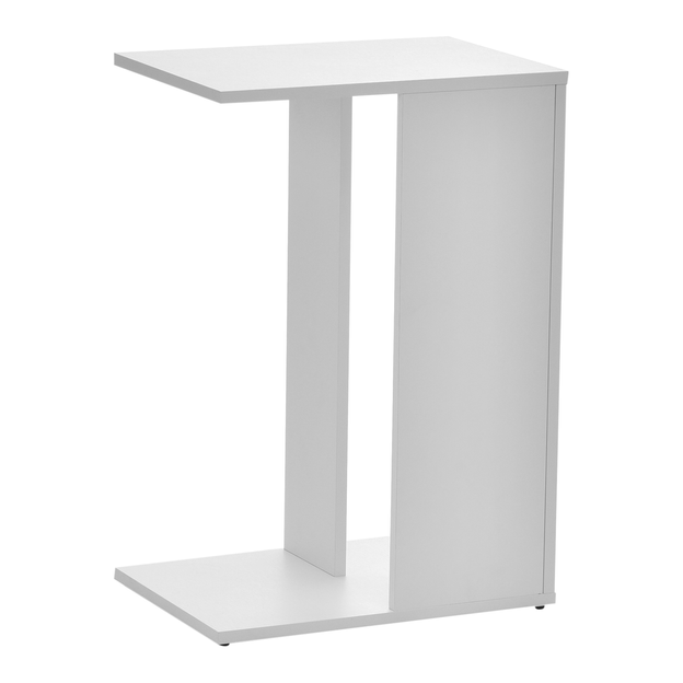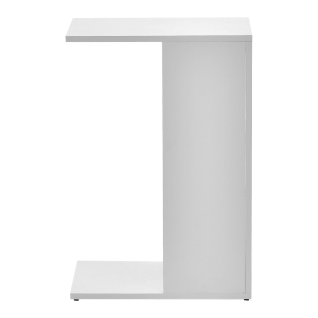 Mesa lateral em MDP (Medium Density Particleboard) de 15 mm revestido com laminado melamínico baixa pressão com bordas em PVC. Possui 1 nicho lateral e sapatas plásticas.
