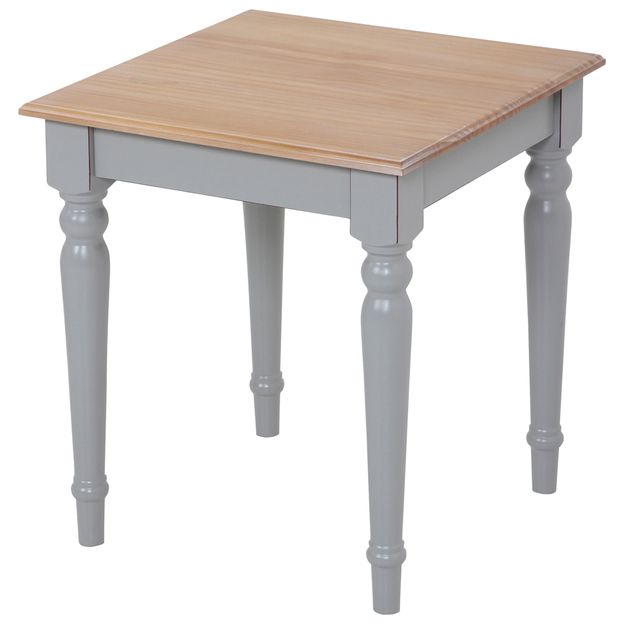 Mesa lateral com estrutura em madeira maciça (Pinus Taeda) torneada com acabamento em pintura e detalhes desgastados. Possui tampo maciço tingido com aplicação de verniz.