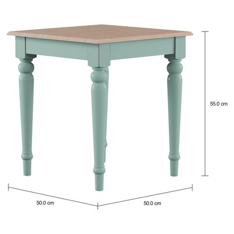 Mesa lateral com estrutura em madeira maciça (Pinus Taeda) torneada com acabamento em pintura e detalhes desgastados. Possui tampo maciço tingido com aplicação de verniz.