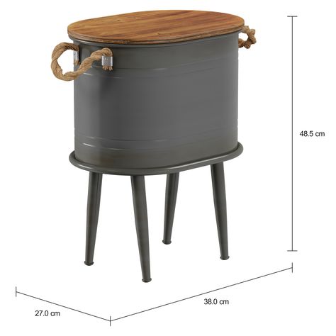 Mesa lateral/baú em chapa e tubo de aço com acabamento em pintura e detalhes em alto-relevo. Possui compartimento com tampo removível em compensado multilaminado, alça para manuseio em sisal e sapatas plásticas reguláveis.
