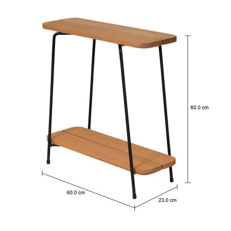 Mesa lateral/floreira com estrutura em tubo de aço com acabamento em pintura epóxi-pó. Possui 2 prateleiras em madeira maciça de reflorestamento (Eucalipto) de 20 mm com tingidor impermeabilizante, tipo stain, com ação inseticida e fungicida.