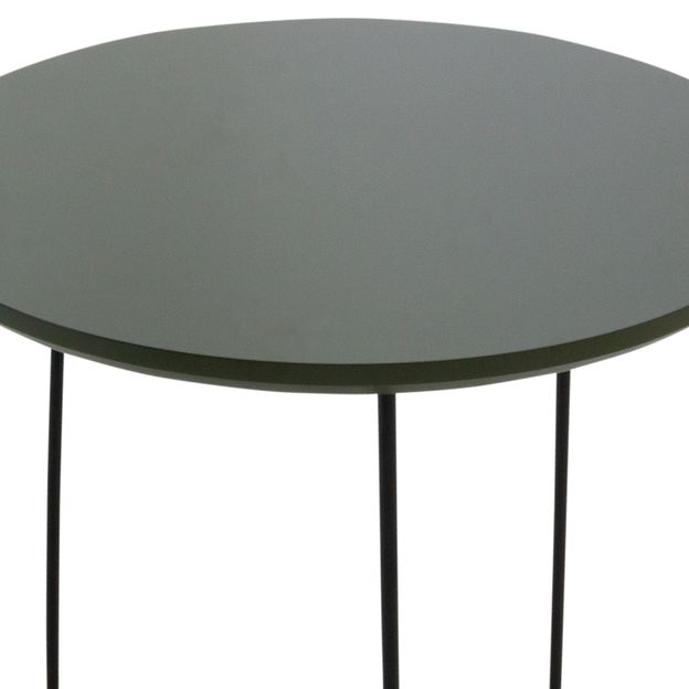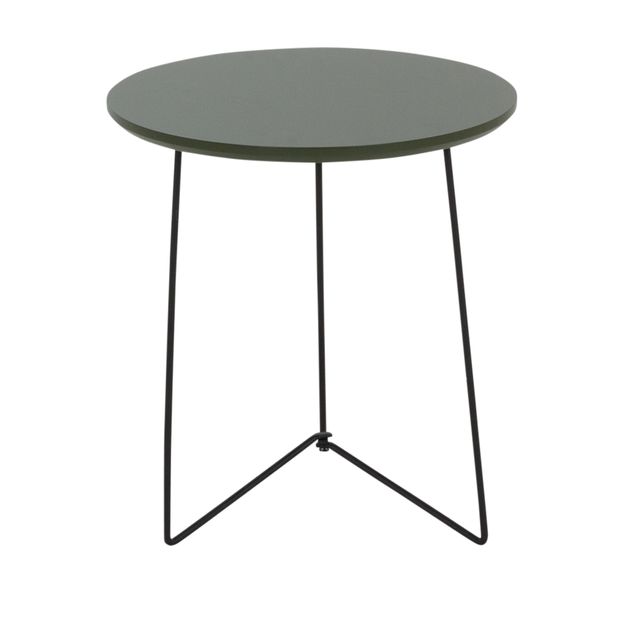 Mesa lateral com base em arame de aço com acabamento em pintura epóxi-pó e tampo em MDF (Medium Density Fiberboard) de 18 mm com pintura laqueada.
