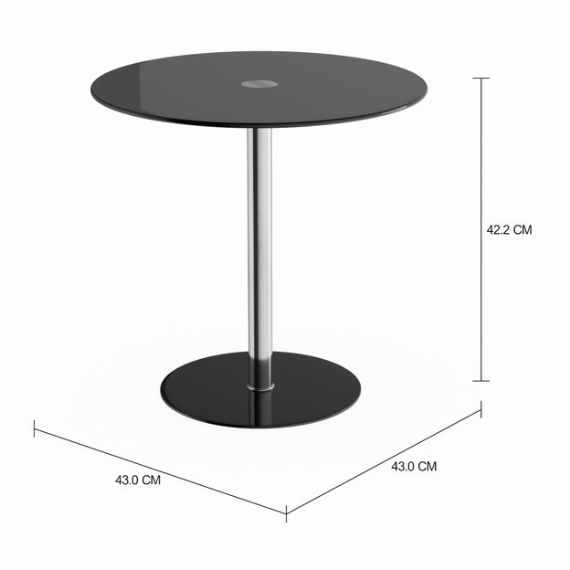 Mesa lateral com base e tampo em vidro temperado com bordas lapidadas colorido por meio de fusão vítrea e haste em tubo de aço com acabamento cromado. Possui sapatas em silicone.