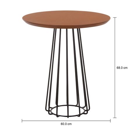 Mesa lateral com base em aramado de aço com acabamento em pintura eletrostática e tampo em MDF (Medium Density Fiberboard) de 25 mm revestido com lâmina natural (Pinus Linheiro) tingida com aplicação de verniz. Possui sapatas plásticas.