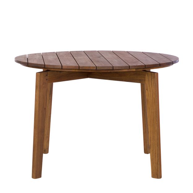 Mesa em madeira maciça (Teca) com acabamento em tingidor impermeabilizante, tipo stain, com ação inseticida e fungicida. Possui furo central para guarda-sol com haste de até Ø4,6 cm.