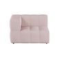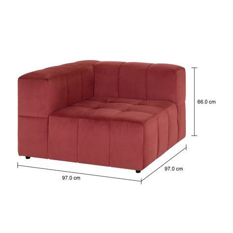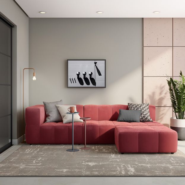 Sofá de canto, com estrutura em madeira maciça (Pinus Elliottii), molas ensacadas individualmente e percintas elásticas revestidas com espuma (D33), manta acrílica e tecido veludo cotelê 100% poliéster. Possui detalhes em capitonês no assento.