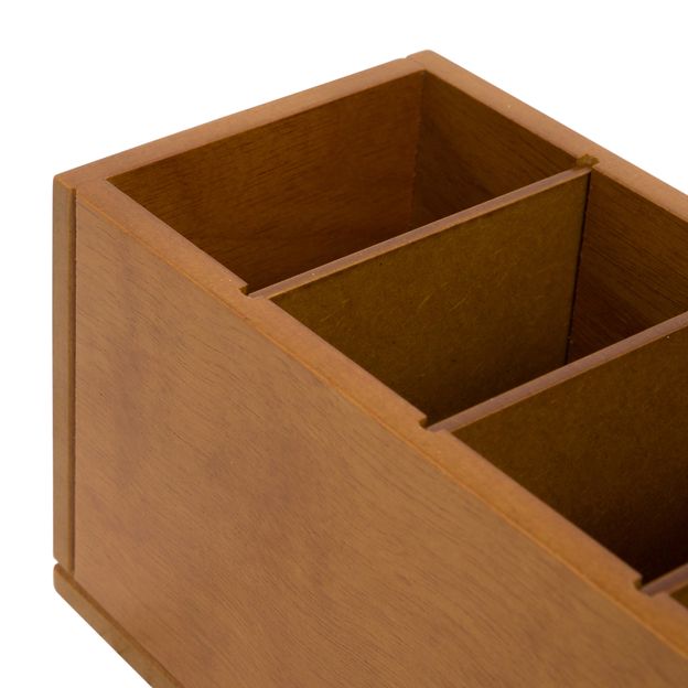 Porta-objetos e controles remotos em MDF (Medium Density Fiberboard) laminado (Curupixá) com aplicação de verniz. Possui 3 divisórias removíveis em chapadura.