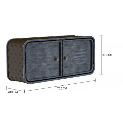Nicho em chapa de aço pintado com acabamento desgastado, aplicação de verniz e detalhes em alto-relevo. Possui 2 portas com puxadores inclusos e fechamento por ímã.