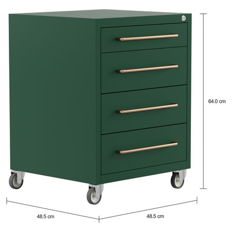 Gaveteiro, com chave, em chapa de aço com acabamento em pintura epóxi-pó. Possui 4 gavetas e rodízios em nylon sem travas.Puxador, para furação 256 mm, em tubo de aço com acabamento cromado.