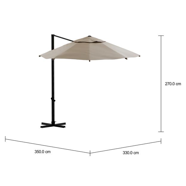Ombrelone pendente, redondo (8 gomos), em aço galvanizado e alumínio pintado em epóxi-pó, revestido com tecido 100% poliéster com proteção UV. Possui sistema mecânico (manivela) de abertura e inclinação em polipropileno, e cobertura rotacionável.