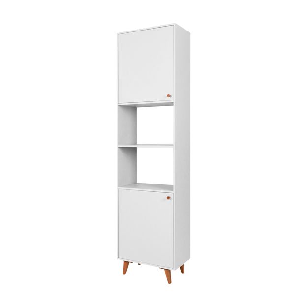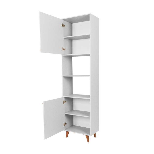 Paneleiro em MDP de 15 mm revestido com laminado melamínico baixa pressão com bordas em PVC. Possui 2 portas, 5 nichos, pés e puxadores em madeira maciça de reflorestamento (Eucalipto) tingida.