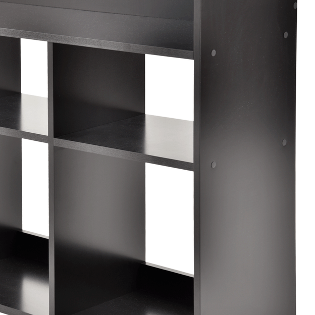 Estante em MDP (Medium Density Particleboard) de 15 m e 18 mm com acabamento em pintura por impressão e bordas em PVC. Possui 13 nichos, sendo 1 para TV, passa-fios, sapatas plásticas e sistema antitombamento.