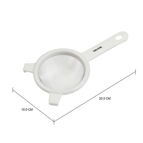 Peneira em polipropileno e aço inoxidável. Possui cabo para que possa ser pendurada e alça para apoio.