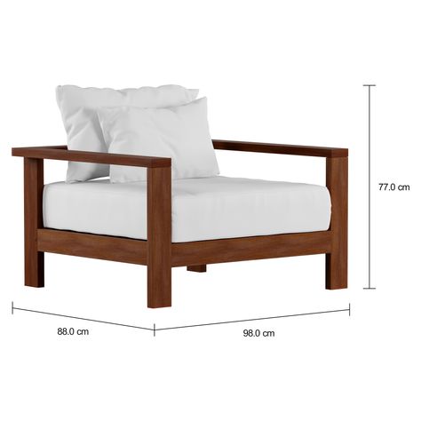 Almofada com enchimento em manta acrílica siliconizada e espuma (D20), revestida com tecido 68% algodão/32% poliéster (face superior) e bagum (face inferior) com tratamento hidrorrepelente. Capa não removível.Almofada com enchimento em manta acrílica siliconizada, revestida com tecido 68% algodão/32% poliéster com tratamento hidrorrepelente. Capa não removível.Almofada com enchimento em manta acrílica siliconizada, revestida com tecido 68% algodão/32% poliéster com tratamento hidrorrepelente. Capa não removível.Estrutura de poltrona em madeira maciça de reflorestamento (Eucalipto) certificada 'FSC®', com acabamento em tingidor impermeabilizante, tipo stain, com ação inseticida e fungicida. Para uso com almofadas da mesma linha (vendidas separadamente).
