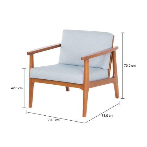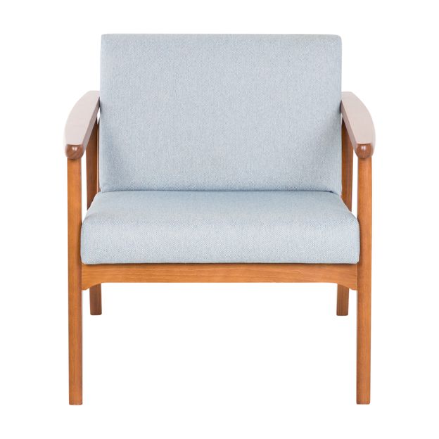 Poltrona com estrutura em madeira maciça de reflorestamento (Pinus Elliottii) tingida com aplicação de verniz, e assento/encosto em compensado revestido com espuma (D28/assento e D20/encosto) e tecido 53% algodão/47% polipropileno.