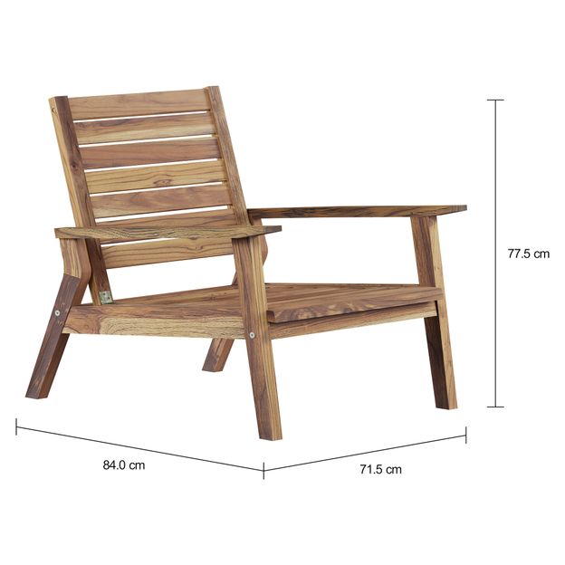 Para uso com almofada da mesma linha (vendida separadamente). Carga máxima: 100kg. A madeira exposta à intempérie pode apresentar alteração na aparência. Recolher após o uso; guardar em ambiente coberto.Altura até o assento: 29 cm e até os braços: 54 cm.