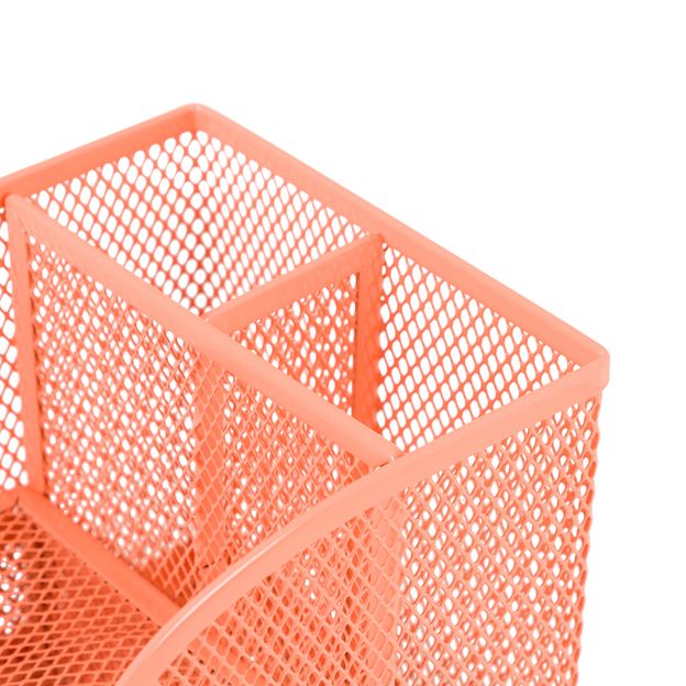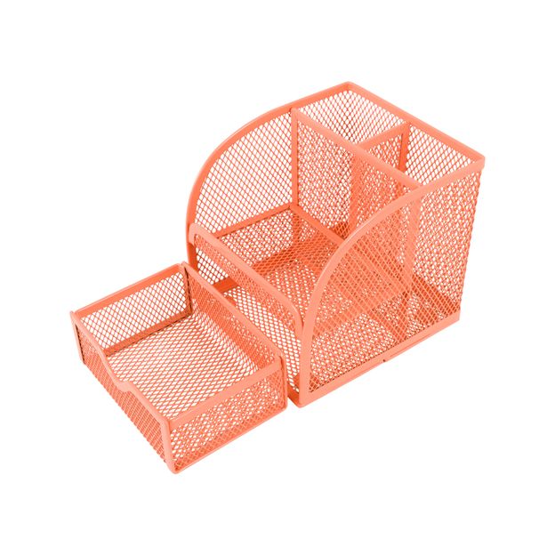 Porta-objetos em chapa, perfil e tela de aço com acabamento em pintura epóxi-pó. Possui 1 gaveta, 3 compartimentos e sapatas em E.V.A.